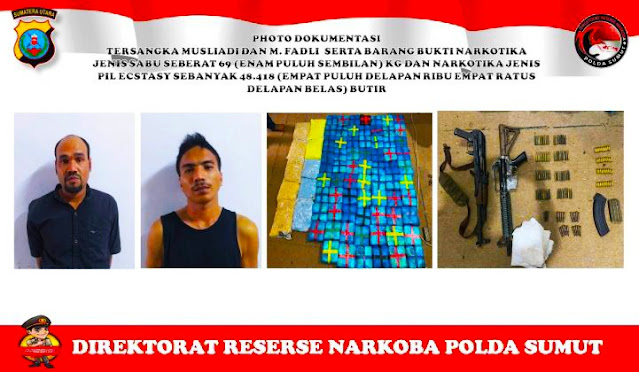 “Pengungkapan kasus ini berkat kerja keras Subdit I dan Subdit III Ditresnarkoba. Adapun barang bukti yang disita dari kedua Tersangka, 69 Kg Sabu, 10 bungkus berisikan Narkotika jenis Pil Ekstasi sebanyak 48.418 Butir, 1 pucuk senjata panjang jenis AK 47, 1 pucuk senjata panjang jenis M16, 150 Butir Amunisi dan 2 unit HP,” kata Hadi.