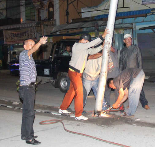 Proses pembongkaran berjalan dengan lancar. Sebelum dibongkar, petugas Dinas TRTB lebih dahulu memutuskan aliran listrik yang masih mengalir ke tiang besi tersebut. Kasi pengawasan, Darwin juga turun tangan ‘mencincang’ tiang besi yang sudah dirobohkan dengan menggunakan mesin las sampai rata dengan jalan.